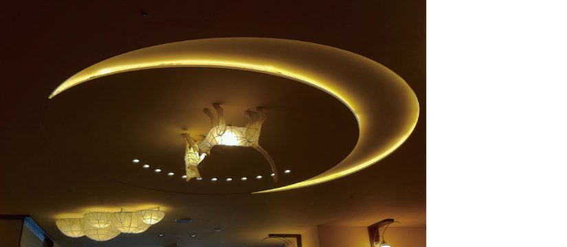 4階センターウォークの「エンターテイメント」をテーマにした施設展開での共用環境を考えるにあたり、時間の表現を楽しいものに出来ればと考え,浮かんできたのがこの「マジックアワー」です。